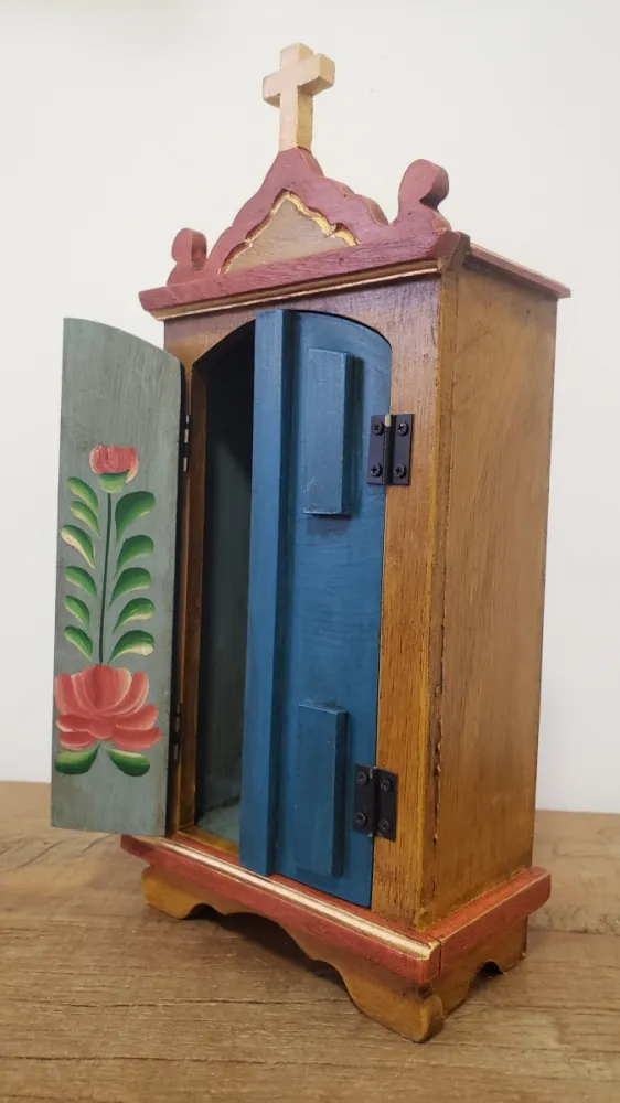O Oratório é produzido em madeira, pintado à mão, com aquele toque rústico.